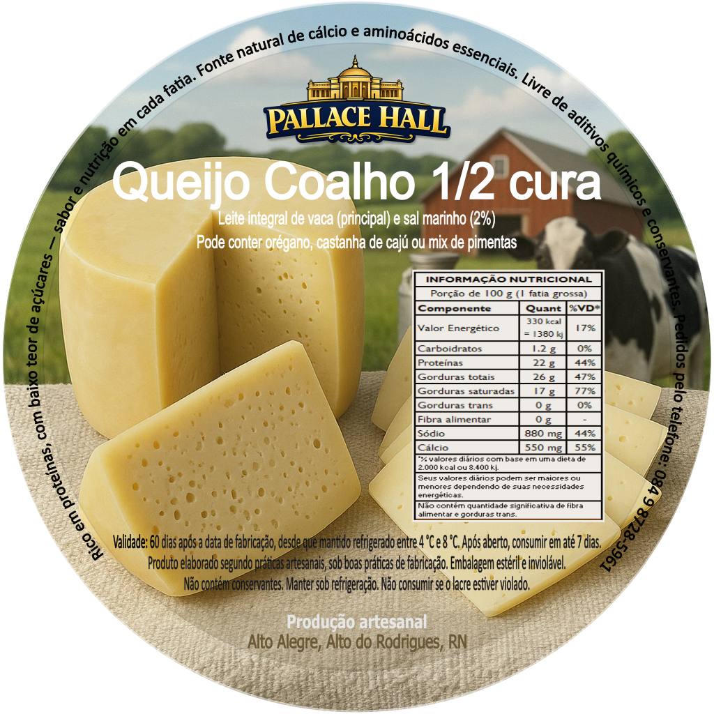 O Laticínio PALLACE HALL é um produtor artesanal localizado em Alto Alegre, município de Alto do Rodrigues, no Estado do Rio Grande do Norte. Trabalhamos com leite integral e processos tradicionais, preservando o sabor e a qualidade natural.
